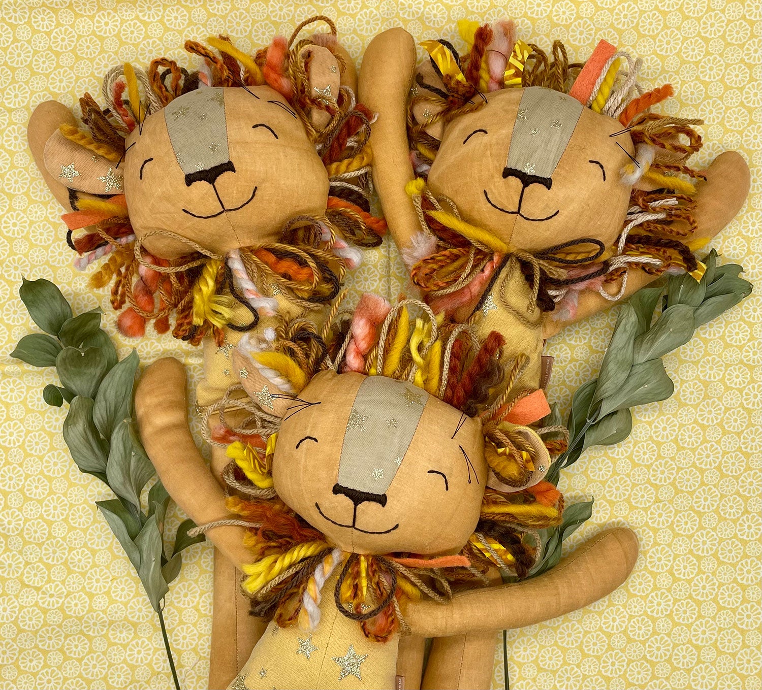 Handmade Lion Dolls in a variety of colors: golden, blue, and purple....